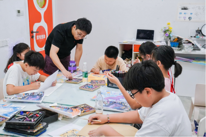 材料探索与“实验家精神”(“哪种材料能表达钢铁般的意志?”): 这是8岁课堂最精彩的部分。工作台上提供的材料极为丰富:除了颜料,还有金属箔片、木头片、织物、陶土、电子元件等。孩子们像实验家一样测试材料:揉皱的锡纸能否表现铠甲的质感?如何将小马达和LED灯嵌入作品,让神骏的眼睛发光?老师鼓励大胆尝试“犯错”,因为每一次“不完美”都是通往最佳解决方案的阶梯。